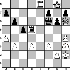 game notation in PGN-format [Event "Siebenschl"] [Site "www.myChess.de"] [Date "2009.07.07"] [Round "1"] [White "rikilatic"] [Black "Ostseeboy"] [Variant "Fischerrandom"] [SetUp "1"] [FEN "bqnbnrkr/pppppppp/8/8/8/8/PPPPPPPP/BQNBNRKR w KQkq - 0 1"] [WhitemyELO "1445"] [BlackmyELO "1269"] [Result "1-0"] [TimeControl "10/2592000"] [WhiteDays "085"] [BlackDays "120"] [MyChessNo "57216"] 1. e4 b6 2. Bf3 Ncd6 3. d3 c5 4. b3 e5 5. Bxe5 Bc7 6. Qb2 Nb5 7. Bxc7 Qxc7 8. a4 Nd4 9. c3 Nxf3+ 10. Nxf3 Nf6 11. h4 Re8 12. Rh3 d5 13. exd5 Nxd5 14. Qd2 Nf4 15. Rg3 Re7 16. Re1 O-O 17. Rxe7 Qxe7 18. Qxf4 Bxf3 19. Rxf3 Qe1+ 20. Kh2 Qxc3 21. Rg3 Qd4 22. Qg5 g6 23. Ne2 Qd8 24. Qh6 Qd6 25. Nf4 Re8 26. Nh5 Qe5 27. Nf4 Rd8 28. Re3 Qf5 29. f3 Qf6 30. Nh3 Rd5 31. Re8# 1-0 position notation in FEN-format 4R1k1/p4p1p/1p3qpQ/2pr4/P6P/1P1P1P1N/6PK/8 - - - 4 31 Captured white pieces: Captured black pieces: Click on a captured piece in order to display the desired move!