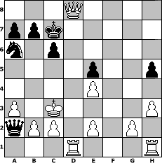 game notation in PGN-format [Event "unter uns Nr. 41 (Advendturnier 2017)"] [Site "www.myChess.de"] [Date "2017.11.29"] [Round "1"] [White "Winston"] [Black "Haneken"] [ECO "C20"] [WhitemyELO "1390"] [BlackmyELO "1052"] [Result "1-0"] [TimeControl "10/864000"] [WhiteDays "29"] [BlackDays "24"] [MyChessNo "110524"] 1. e4 e5 2. a3 Nf6 3. Nc3 Bc5 4. Nf3 d6 5. h3 O-O 6. Bc4 Be6 7. Bxe6 fxe6 8. d3 h6 9. d4 exd4 10. Nxd4 e5 11. Ne6 Qd7 12. Nxf8 Kxf8 13. Qf3 h5 14. Bg5 Qe6 15. Nd5 Qf7 16. O-O-O c6 17. Nxf6 gxf6 18. Bd2 Qa2 19. Qxf6+ Ke8 20. Qg6+ Kd7 21. Bc3 Bxf2 22. Qf5+ Kc7 23. Qxf2 Na6 24. Qf6 Rd8 25. Bxe5 Qa1+ 26. Kd2 Qa2 27. Kc3 dxe5 28. Qxd8# 1-0 position notation in FEN-format 3Q4/ppk5/n1p5/4p2p/4P3/P1K4P/qPP1P1P1/3R3R - - - 0 28 Captured white pieces: Captured black pieces: Click on a captured piece in order to display the desired move!