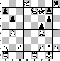 game notation in PGN-format [Event "^^Frohes neues Jahr^^"] [Site "www.myChess.de"] [Date "2007.12.29"] [Round "1"] [White "thw"] [Black "commander"] [ECO "B01"] [WhitemyELO "1527"] [BlackmyELO "1199"] [Result "1-0"] [TimeControl "10/864000"] [WhiteDays "30"] [BlackDays "28"] [MyChessNo "41056"] 1. e4 d5 2. exd5 Qxd5 3. Nc3 Qe6+ 4. Be2 Nc6 5. Nf3 Nf6 6. O-O Ne4 7. Nxe4 Qxe4 8. Re1 Qg6 9. d4 b6 10. Bb5 Bd7 11. d5 Na5 12. Bxd7+ Kxd7 13. Ne5+ Kc8 14. Nxg6 hxg6 15. Qg4+ Kb7 16. b4 f5 17. Qxg6 Nc4 18. Qc6+ Kc8 19. Qxa8+ Kd7 20. Qc6+ Kc8 21. Qxc4 Kb7 22. Qc6+ Kc8 23. Bf4 Kd8 24. Qxc7+ Ke8 25. d6 Kf7 26. d7 g6 27. d8=Q Bg7 28. Qcxe7# 1-0 position notation in FEN-format 3Q3r/p3Qkb1/1p4p1/5p2/1P3B2/8/P1P2PPP/R3R1K1 - - - 0 28 Captured white pieces: Captured black pieces: Click on a captured piece in order to display the desired move!