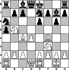 game notation in PGN-format [Event "Skandinavisch"] [Site "www.myChess.de"] [Date "2007.09.14"] [Round "1"] [White "Meister64"] [Black "MichaelKnopf"] [ECO "B01"] [WhitemyELO "1673"] [BlackmyELO "1427"] [Result "1-0"] [TimeControl "10/864000"] [WhiteDays "15"] [BlackDays "00"] [MyChessNo "38170"] 1. e4 d5 2. exd5 Qxd5 3. Nf3 g6 4. d4 Bg7 5. Nc3 Qd8 6. Bc4 e6 7. O-O Ne7 8. Bf4 a5 9. Nb5 Na6 10. Re1 1-0 position notation in FEN-format r1bqk2r/1pp1npbp/n3p1p1/pN6/2BP1B2/5N2/PPP1PPPP/R2QR1K1 - kq - 3 10 Captured white pieces: Captured black pieces: Click on a captured piece in order to display the desired move!