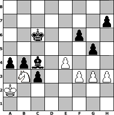game notation in PGN-format [Event "Winterende2014"] [Site "www.myChess.de"] [Date "2014.03.06"] [Round "1"] [White "borsti"] [Black "Andylein1989"] [ECO "C68"] [WhitemyELO "1202"] [BlackmyELO "1401"] [Result "0-1"] [TimeControl "10/1728000"] [WhiteDays "100"] [BlackDays "080"] [MyChessNo "93357"] 1. e4 e5 2. Nf3 Nc6 3. Bb5 a6 4. Bxc6 dxc6 5. h3 Qd6 6. b3 Be6 7. Ba3 c5 8. b4 cxb4 9. Bb2 f6 10. c3 O-O-O 11. d4 bxc3 12. Bxc3 exd4 13. Qxd4 Qxd4 14. Bxd4 Bb4+ 15. Bc3 Bxc3+ 16. Nxc3 Ne7 17. O-O Rd3 18. Rac1 Rhd8 19. a4 Nc6 20. Ne2 g5 21. Nc3 Na5 22. Rfd1 Rxd1+ 23. Rxd1 Rxd1+ 24. Nxd1 Nb3 25. Nb2 Nc5 26. Nd2 Bd7 27. f3 Nxa4 28. Nxa4 Bxa4 29. Kf2 b5 30. Ke3 c5 31. Kd3 Kc7 32. Kc3 Kc6 33. Nf1 b4+ 34. Kc4 a5 35. Nd2 Bb5+ 36. Kb3 a4+ 37. Ka2 c4 38. g3 c3 39. Nb3 Bc4 0-1 position notation in FEN-format 8/7p/2k2p2/6p1/ppb1P3/1Np2PPP/K7/8 - - - 2 40 Captured white pieces: Captured black pieces: Click on a captured piece in order to display the desired move!