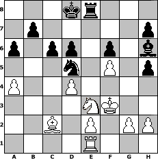 game notation in PGN-format [Event "Unter uns Nr. 8"] [Site "www.myChess.de"] [Date "2013.03.03"] [Round "1"] [White "Haki"] [Black "alpacino"] [ECO "C41"] [WhitemyELO "1226"] [BlackmyELO "1354"] [Result "0-1"] [TimeControl "10/864000"] [WhiteDays "40"] [BlackDays "39"] [MyChessNo "86938"] 1. e4 e5 2. Nf3 d6 3. d4 f6 4. Bc4 Nc6 5. O-O Nh6 6. Bxh6 gxh6 7. c3 Bd7 8. Nh4 Qe7 9. Qh5+ Kd8 10. Nf5 Bxf5 11. Qxf5 exd4 12. Qe6 Qxe6 13. Bxe6 Ne5 14. cxd4 Nd3 15. Bd5 c6 16. Bc4 Nxb2 17. Bb3 Nd3 18. f4 Bg7 19. f5 Re8 20. Nd2 Nb4 21. Nc4 Kc7 22. Rfd1 Rxe4 23. Re1 Ree8 24. Ne3 Bf8 25. Ng4 Bg7 26. a3 Nd3 27. Rxe8 Rxe8 28. Bc2 Nf4 29. Kf2 h5 30. Ne3 Bh6 31. a4 a6 32. Re1 Kd8 33. Kf3 Nd5 0-1 position notation in FEN-format 3kr3/1p5p/p1pp1p1b/3n1P1p/P2P4/4NK2/2B1P1PP/4R3 - - - 4 34 Captured white pieces: Captured black pieces: Click on a captured piece in order to display the desired move!