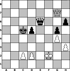 game notation in PGN-format [Event "Lied der Nibelungen"] [Site "www.myChess.de"] [Date "2021.06.18"] [Round "1"] [White "lotchi"] [Black "Seneca"] [ECO "A41"] [WhitemyELO "1297"] [BlackmyELO "1472"] [Result "1/2-1/2"] [TimeControl "10/2592000"] [WhiteDays "116"] [BlackDays "136"] [MyChessNo "122430"] 1. d4 d6 2. e4 Nf6 3. Nc3 c6 4. f4 g6 5. h3 Bg7 6. Nf3 O-O 7. Bc4 a5 8. a4 Na6 9. g4 Nc7 10. Be3 Bd7 11. O-O e6 12. e5 dxe5 13. fxe5 Nfd5 14. Bg5 Nxc3 15. bxc3 f6 16. Bh4 g5 17. Bg3 Nd5 18. Bxd5 exd5 19. Qb1 b5 20. Qe1 fxe5 21. dxe5 Be6 22. axb5 cxb5 23. Nd4 Qd7 24. Qe2 b4 25. cxb4 axb4 26. Nxe6 Rxf1+ 27. Qxf1 Rxa1 28. Qxa1 Qxe6 29. Qd4 Bf8 30. Be1 h6 31. Bxb4 Bxb4 32. Qxb4 Qxe5 33. Qb3 Kg7 34. Qb7+ Kf6 35. Qc6+ Qe6 36. Qc3+ Qe5 37. Qc6+ Qe6 38. Qc3+ Ke7 39. Qg7+ Kd6 40. Kf2 Kc5 1/2-1/2 position notation in FEN-format 8/6Q1/4q2p/2kp2p1/6P1/7P/2PP1K2/8 - - - 16 41 Captured white pieces: Captured black pieces: Click on a captured piece in order to display the desired move!