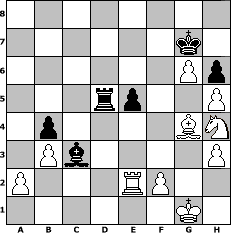 game notation in PGN-format [Event "Auf dem Weg zu 1600 ELO"] [Site "www.myChess.de"] [Date "2008.02.19"] [Round "1"] [White "freizeitspieler"] [Black "Seneca"] [ECO "A42"] [WhitemyELO "1497"] [BlackmyELO "1586"] [Result "1-0"] [TimeControl "10/864000"] [WhiteDays "35"] [BlackDays "25"] [MyChessNo "42701"] 1. d4 d6 2. c4 Nf6 3. Nc3 g6 4. Bf4 Bg7 5. e3 Nbd7 6. Nf3 c5 7. d5 Nh5 8. Qc2 Nxf4 9. exf4 a6 10. Bd3 Nf6 11. Ng5 Rb8 12. h3 Bd7 13. O-O Nh5 14. Ne2 O-O 15. f5 Bf6 16. Nf3 e5 17. dxe6 fxe6 18. fxg6 h6 19. Be4 b5 20. Rad1 Qc7 21. Qd2 Kg7 22. Qxd6 Qxd6 23. Rxd6 Rfd8 24. g4 Bc8 25. Rxd8 Bxd8 26. gxh5 Bf6 27. cxb5 axb5 28. b3 b4 29. Rc1 Rb6 30. Rxc5 Ba6 31. Rc2 Bxe2 32. Rxe2 Bc3 33. Nd2 Rb5 34. Bf3 Rg5+ 35. Bg4 Rd5 36. Nf3 e5 37. Nh4 1-0 position notation in FEN-format 8/6k1/6Pp/3rp2P/1p4BN/1Pb4P/P3RP2/6K1 - - - 1 37 Captured white pieces: Captured black pieces: Click on a captured piece in order to display the desired move!
