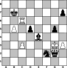 game notation in PGN-format [Event "^^Frohes neues Jahr^^"] [Site "www.myChess.de"] [Date "2007.12.29"] [Round "1"] [White "bluescreenlover"] [Black "Helmut48"] [ECO "C40"] [WhitemyELO "1278"] [BlackmyELO "1395"] [Result "0-1"] [TimeControl "10/864000"] [WhiteDays "30"] [BlackDays "49"] [MyChessNo "41055"] 1. e4 e5 2. Nf3 f6 3. Bc4 a6 4. a3 c6 5. Nc3 b5 6. Bxg8 Rxg8 7. b4 g5 8. d3 d6 9. Be3 Bg4 10. O-O Nd7 11. h3 Be6 12. Nd2 Bf7 13. Ne2 Bg6 14. c3 Bf7 15. Ng3 Bg6 16. Nb3 Qc7 17. Na5 Rb8 18. d4 d5 19. Qd3 Rd8 20. dxe5 Nxe5 21. Bd4 Nxd3 22. Bxf6 Be7 23. Bxe7 Qxe7 24. Nxc6 Qd7 25. Nxd8 Kxd8 26. e5 Nxe5 27. Rfe1 Re8 28. Rad1 Kc8 29. Re3 Nc4 30. Rxe8+ Bxe8 31. Ne2 Nxa3 32. Nd4 Bf7 33. Ra1 Nc4 34. Rxa6 Ne5 35. Nxb5 Qxb5 36. Ra8+ Kb7 37. Rh8 Bg6 38. Rd8 Qd3 39. Rd6 Qd1+ 40. Kh2 Kc7 41. Ra6 Nd3 42. b5 Nxf2 43. Rc6+ Kb7 44. Kg3 Qg1 45. Rc5 Be4 46. Rc6 Qxg2# 0-1 position notation in FEN-format 8/1k5p/2R5/1P1p2p1/4b3/2P3KP/5nq1/8 - - - 0 47 Captured white pieces: Captured black pieces: Click on a captured piece in order to display the desired move!