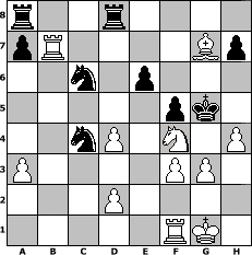 game notation in PGN-format [Event "Nimzo-Indisch"] [Site "www.myChess.de"] [Date "2011.10.17"] [Round "1"] [White "Chaos"] [Black "Gauss1233"] [ECO "?"] [WhitemyELO "1833"] [BlackmyELO "1428"] [Result "1-0"] [TimeControl "10/2592000"] [WhiteDays "71"] [BlackDays "85"] [MyChessNo "76930"] 1. d4 Nf6 2. c4 e6 3. Nc3 Bb4 4. a3 Bxc3+ 5. bxc3 d6 6. e4 Nxe4 7. Qg4 d5 8. Qxg7 Qf6 9. Qxf6 Nxf6 10. Bh6 Ne4 11. f3 Nxc3 12. Rc1 Na4 13. cxd5 c6 14. Bb5 Nb6 15. dxc6 Ke7 16. cxb7 Bxb7 17. Rc7+ Kf6 18. Rxb7 Rd8 19. Ne2 Kg6 20. Bf4 Nd5 21. Be5 f6 22. Bd3+ f5 23. O-O Nc6 24. Bc4 Ne3 25. Nf4+ Kh6 26. Bg7+ Kg5 27. g3 Nxc4 28. h4# 1-0 position notation in FEN-format r2r4/pR4Bp/2n1p3/5pk1/2nP1N1P/P4PP1/3P4/5RK1 - - - 0 28 Captured white pieces: Captured black pieces: Click on a captured piece in order to display the desired move!