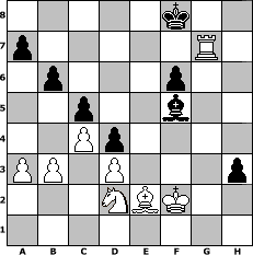 game notation in PGN-format [Event ""Freibier f"] [Site "www.myChess.de"] [Date "2005.05.27"] [Round "1"] [White "MichaelKnopf"] [Black "bane"] [ECO "B01"] [WhitemyELO "1598"] [BlackmyELO "1767"] [Result "1/2-1/2"] [TimeControl "10/1728000"] [WhiteDays "100"] [BlackDays "100"] [MyChessNo "13649"] 1. e4 d5 2. e5 d4 3. Nf3 c5 4. g3 Be6 5. b3 b6 6. c3 Nc6 7. c4 Nb4 8. d3 h6 9. Bg2 Bg4 10. a3 Nc6 11. O-O Nxe5 12. h3 Nxf3+ 13. Bxf3 Bxh3 14. Bg2 Qd7 15. Qf3 Rd8 16. Kh2 Bg4 17. Qf4 g5 18. Qd2 Nf6 19. f3 Bf5 20. Rh1 e5 21. g4 Bg6 22. Kg1 h5 23. Qxg5 Bh6 24. Qxf6 Rh7 25. Bxh6 Rxh6 26. Qxe5+ Qe7 27. Qxe7+ Kxe7 28. Bf1 h4 29. g5 Rh5 30. f4 Rdh8 31. Be2 R5h7 32. Rh3 Bf5 33. Rh2 h3 34. Nd2 Rh4 35. Rf1 Rg8 36. Rf3 f6 37. Rg3 Rxf4 38. Rf2 Rxg5 39. Rxg5 Rxf2 40. Rg7+ Kf8 41. Kxf2 1/2-1/2 position notation in FEN-format 5k2/p5R1/1p3p2/2p2b2/2Pp4/PP1P3p/3NBK2/8 - - - 0 41 Captured white pieces: Captured black pieces: Click on a captured piece in order to display the desired move!