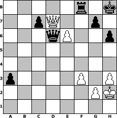 | game notation in PGN-format [Event "Saphir"] [Site "www.myChess.de"] [Date "2021.05.11"] [Round "2"] [White "beowulf"] [Black "lotchi"] [ECO "C65"] [WhitemyELO "1404"] [BlackmyELO "1316"] [Result "0-1"] [TimeControl "10/864000"] [WhiteDays "47"] [BlackDays "40"] [MyChessNo "122233"] 1. e4 e5 2. Nf3 Nc6 3. Bb5 Nf6 4. Nc3 a6 5. Ba4 b5 6. Bb3 Bc5 7. O-O h6 8. d3 d6 9. h3 Be6 10. Bxe6 fxe6 11. Re1 Qd7 12. Be3 Bxe3 13. Rxe3 O-O 14. Ne2 b4 15. c3 bxc3 16. bxc3 d5 17. Nd2 d4 18. cxd4 exd4 19. Rg3 a5 20. Nf4 e5 21. Ng6 Rf7 22. Nc4 Nh5 23. Rf3 Rxf3 24. Ngxe5 Rxd3 25. Qxd3 Nxe5 26. Nxe5 Qe6 27. Qxd4 Re8 28. Nf3 Nf4 29. Re1 Qxa2 30. Nd2 a4 31. e5 Rf8 32. Ne4 Ne2+ 33. Rxe2 Qxe2 34. Qd5+ Kh8 35. f3 a3 36. Nc3 Qe1+ 37. Kh2 Qxc3 38. e6 Qb4 39. Qd7 Qd6+ 0-1 position notation in FEN-format 5r1k/2pQ2p1/3qP2p/8/8/p4P1P/6PK/8 - - - 3 40 Captured white pieces:                              Captured black pieces:                               Click on a captured piece in order to display the desired move!