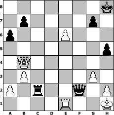 game notation in PGN-format [Event "Sommer 2025_1"] [Site "www.myChess.de"] [Date "2025.06.20"] [Round "1"] [White "Lohl"] [Black "UPS"] [ECO "B50"] [WhitemyELO "1299"] [BlackmyELO "1647"] [Result "0-1"] [TimeControl "10/1728000"] [WhiteDays "80"] [BlackDays "36"] [MyChessNo "133442"] 1. e4 c5 2. Nf3 d6 3. c3 e5 4. d4 cxd4 5. cxd4 exd4 6. Nxd4 a6 7. Nc3 Nf6 8. Bc4 Be7 9. O-O O-O 10. Re1 Qc7 11. b3 Nc6 12. Bf4 Ne5 13. Nd5 Nxd5 14. Bxd5 Bf6 15. Rc1 Qe7 16. Bg3 Be6 17. Bxe6 fxe6 18. f4 Ng6 19. f5 Bxd4+ 20. Qxd4 Ne5 21. Bxe5 dxe5 22. Qxe5 Rac8 23. Rxc8 Rxc8 24. g3 Re8 25. Re3 exf5 26. Qxf5 Rf8 27. Qg4 Qf6 28. Qe2 Qe5 29. Qc4+ Kh8 30. Qb4 Qf6 31. Re1 Qf2+ 32. Kh1 h5 33. e5 Rc8 34. e6 Rc2 0-1 position notation in FEN-format 7k/1p4p1/p3P3/7p/1Q6/1P4P1/P1r2q1P/4R2K - - - 1 35 Captured white pieces: Captured black pieces: Click on a captured piece in order to display the desired move!