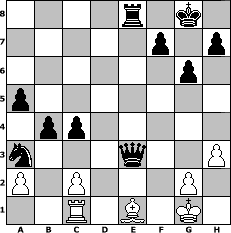 game notation in PGN-format [Event "Herbst 2011"] [Site "www.myChess.de"] [Date "2011.09.14"] [Round "1"] [White "bavaria"] [Black "sprinterde"] [ECO "D00"] [WhitemyELO "1482"] [BlackmyELO "1691"] [Result "0-1"] [TimeControl "10/864000"] [WhiteDays "40"] [BlackDays "40"] [MyChessNo "76302"] 1. d4 d5 2. e3 g6 3. Qd2 Nc6 4. Nf3 Nf6 5. Qc3 Ne4 6. Qa3 e5 7. dxe5 Bxa3 8. bxa3 O-O 9. Nbd2 Bg4 10. Be2 Bxf3 11. Bxf3 Nxd2 12. Bxd2 Nxe5 13. Be2 Nc4 14. Bb4 Re8 15. O-O a5 16. Bc5 b6 17. Bd4 Nxa3 18. Rac1 c5 19. Bb2 Nc4 20. Bc3 b5 21. Rb1 b4 22. Be1 Na3 23. Rc1 d4 24. Bd2 c4 25. Be1 dxe3 26. fxe3 Rxe3 27. Rf2 Qe7 28. Kf1 Re8 29. Kg1 Rxe2 30. Rxe2 Qxe2 31. h3 Qe3+ 0-1 position notation in FEN-format 4r1k1/5p1p/6p1/p7/1pp5/n3q2P/P1P3P1/2R1B1K1 - - - 1 32 Captured white pieces: Captured black pieces: Click on a captured piece in order to display the desired move!