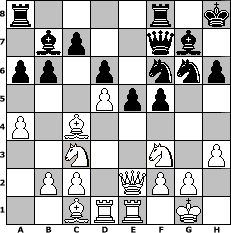 game notation in PGN-format [Event "Winter 2018"] [Site "www.myChess.de"] [Date "2018.01.10"] [Round "2"] [White "jeremyt"] [Black "Erich"] [ECO "B06"] [WhitemyELO "2125"] [BlackmyELO "2112"] [Result "1/2-1/2"] [TimeControl "10/2592000"] [WhiteDays "29"] [BlackDays "90"] [MyChessNo "111050"] 1. e4 g6 2. d4 Bg7 3. Nf3 d6 4. Nc3 Nd7 5. Bc4 e6 6. Bg5 Ne7 7. Qd2 h6 8. Be3 a6 9. a4 b6 10. O-O Bb7 11. Ba2 Nf6 12. d5 e5 13. Qd3 O-O 14. Bc4 Nh5 15. Rad1 Bc8 16. Qe2 Kh8 17. Rfe1 Qe8 18. h3 f5 19. Nh2 Nf6 20. exf5 gxf5 21. Bc1 Bb7 22. Nf3 Ng6 23. Kh2 Qf7 24. Kg1 1/2-1/2 position notation in FEN-format r4r1k/1bp2qb1/pp1p1nnp/3Ppp2/P1B5/2N2N1P/1PP1QPP1/2BRR1K1 - - - 7 24 Captured white pieces: Captured black pieces: Click on a captured piece in order to display the desired move!