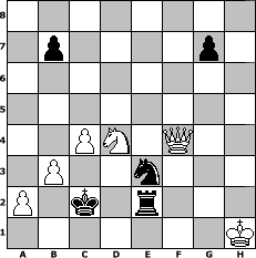 game notation in PGN-format [Event "^^Frohes neues Jahr^^"] [Site "www.myChess.de"] [Date "2007.12.29"] [Round "1"] [White "BobbyF4"] [Black "bruno"] [ECO "B20"] [WhitemyELO "1520"] [BlackmyELO "1517"] [Result "1-0"] [TimeControl "10/864000"] [WhiteDays "39"] [BlackDays "40"] [MyChessNo "41085"] 1. e4 c5 2. d4 e6 3. e5 cxd4 4. c3 Nc6 5. Nf3 d6 6. Bb5 Bd7 7. Bg5 Be7 8. h4 Bxg5 9. hxg5 Nxe5 10. Bxd7+ Qxd7 11. Nxd4 f6 12. f4 Nc4 13. Kf2 fxg5 14. b3 Nb6 15. Nxe6 Qxe6 16. Re1 Qxe1+ 17. Qxe1+ Ne7 18. Qe6 gxf4 19. Nd2 Rc8 20. Re1 Rc7 21. Qxd6 Rd7 22. Rxe7+ Rxe7 23. Qb8+ Kf7 24. Qxh8 Nd5 25. Qxh7 Ne3 26. Ne4 Ke6 27. c4 Ke5 28. Ng5 Kd4 29. Nf3+ Kc3 30. Qh5 Nd1+ 31. Kg1 Re2 32. Qa5+ Kd3 33. Qxa7 Ne3 34. Qd4+ Kc2 35. Qxf4 Rxg2+ 36. Kh1 Re2 37. Nd4+ 1-0 position notation in FEN-format 8/1p4p1/8/8/2PN1Q2/1P2n3/P1k1r3/7K - - - 3 37 Captured white pieces: Captured black pieces: Click on a captured piece in order to display the desired move!