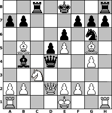 game notation in PGN-format [Event "Krampusturnier 2"] [Site "www.myChess.de"] [Date "2014.12.01"] [Round "1"] [White "Jonas84"] [Black "Duschgel"] [ECO "B10"] [WhitemyELO "1482"] [BlackmyELO "1628"] [Result "1-0"] [TimeControl "10/1728000"] [WhiteDays "20"] [BlackDays "02"] [MyChessNo "96977"] 1. e4 c6 2. Nf3 d5 3. e5 c5 4. c3 Bg4 5. d4 e6 6. h3 Nc6 7. hxg4 Nge7 8. Bg5 Qb6 9. Qc2 Rc8 10. Qd2 Ng6 11. Bd3 cxd4 12. cxd4 Bb4 13. Nc3 Nxd4 14. Nxd4 Qxd4 15. Bb5+ 1-0 position notation in FEN-format 2r1k2r/pp3ppp/4p1n1/1B1pP1B1/1b1q2P1/2N5/PP1QPPP1/R3K2R - KQk - 1 15 Captured white pieces: Captured black pieces: Click on a captured piece in order to display the desired move!