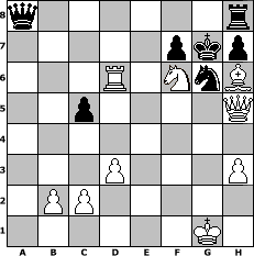 game notation in PGN-format [Event "wie w"] [Site "www.myChess.de"] [Date "2013.11.16"] [Round "1"] [White "Duschgel"] [Black "Joschi"] [ECO "A16"] [WhitemyELO "1587"] [BlackmyELO "1574"] [Result "1-0"] [TimeControl "10/1728000"] [WhiteDays "20"] [BlackDays "20"] [MyChessNo "91153"] 1. c4 Nf6 2. Nc3 c5 3. g3 Nc6 4. Bg2 e6 5. e4 d6 6. Nge2 a6 7. d3 Be7 8. O-O Rb8 9. f4 Qc7 10. h3 b5 11. cxb5 axb5 12. a3 O-O 13. f5 Bd7 14. g4 exf5 15. exf5 b4 16. axb4 Nxb4 17. Ng3 Bc6 18. Bxc6 Qxc6 19. g5 Nfd5 20. Nce4 Ra8 21. Rxa8 Qxa8 22. f6 gxf6 23. gxf6 Nxf6 24. Nxf6+ Bxf6 25. Rxf6 Nd5 26. Rxd6 Ne7 27. Nh5 Ng6 28. Nf6+ Kg7 29. Qh5 Rh8 30. Bh6# 1-0 position notation in FEN-format q6r/5pkp/3R1NnB/2p4Q/8/3P3P/1PP5/6K1 - - - 8 30 Captured white pieces: Captured black pieces: Click on a captured piece in order to display the desired move!