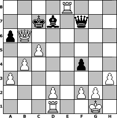 game notation in PGN-format [Event "Frohes Fest und spannende Spiele"] [Site "www.myChess.de"] [Date "2018.12.21"] [Round "1"] [White "reisinger"] [Black "augustus"] [ECO "D06"] [WhitemyELO "1437"] [BlackmyELO "1072"] [Result "1-0"] [TimeControl "10/864000"] [WhiteDays "40"] [BlackDays "24"] [MyChessNo "113774"] 1. d4 d5 2. c4 Nf6 3. Nc3 e6 4. c5 c6 5. Qc2 Be7 6. Bf4 Bd7 7. h3 O-O 8. e4 Na6 9. a3 dxe4 10. Nxe4 Nxe4 11. Qxe4 b6 12. Bxa6 bxc5 13. dxc5 Qa5+ 14. b4 Qxa6 15. Ne2 f5 16. Qe3 h6 17. O-O g5 18. Be5 f4 19. Qe4 Bf6 20. Qg6+ Kh8 21. Bxf6+ Rxf6 22. Qxf6+ Kg8 23. Nd4 Qc8 24. Rae1 Qe8 25. Qxh6 Qf7 26. Qxg5+ Kf8 27. Re5 Re8 28. Rfe1 a6 29. Qh6+ Ke7 30. Nxc6+ Bxc6 31. Rxe6+ Kd8 32. Rd1+ Bd7 33. Rxe8+ Kc7 34. Qb6# 1-0 position notation in FEN-format 4R3/2kb1q2/pQ6/2P5/1P3p2/P6P/3P1PP1/3R2K1 - - - 2 34 Captured white pieces: ![]() ![]() ![]() ![]() ![]() ![]() ![]() ![]() ![]() ![]() ![]() ![]() ![]() ![]() ![]() Captured black pieces: ![]() ![]() ![]() ![]() ![]() ![]() ![]() ![]() ![]() ![]() ![]() ![]() ![]() ![]() ![]() Click on a captured piece in order to display the desired move!
