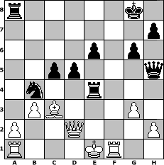 game notation in PGN-format [Event "Wolga-Benk"] [Site "www.myChess.de"] [Date "2004.06.19"] [Round "1"] [White "Naunhofer"] [Black "PeterLoskarn"] [ECO "A58"] [WhitemyELO "1701"] [BlackmyELO "1814"] [Result "0-1"] [TimeControl "10/864000"] [WhiteDays "25"] [BlackDays "28"] [MyChessNo "5240"] 1. d4 Nf6 2. c4 c5 3. d5 b5 4. cxb5 a6 5. bxa6 Bxa6 6. Nc3 g6 7. e4 Bxf1 8. Kxf1 d6 9. Nge2 Bg7 10. b3 Nxe4 11. Qd3 Nxc3 12. Nxc3 O-O 13. Bb2 Na6 14. Ke2 e6 15. dxe6 fxe6 16. f3 Qg5 17. g3 d5 18. f4 Rxf4 19. Rhf1 Qh5+ 20. Ke1 Nb4 21. Qd2 Bxc3 22. Bxc3 Re4+ 0-1 position notation in FEN-format r5k1/7p/4p1p1/2pp3q/1n2r3/1PB3P1/P2Q3P/R3KR2 - - - 1 23 Captured white pieces: ![]() ![]() ![]() ![]() ![]() ![]() ![]() ![]() ![]() ![]() ![]() ![]() ![]() ![]() ![]() Captured black pieces: ![]() ![]() ![]() ![]() ![]() ![]() ![]() ![]() ![]() ![]() ![]() ![]() ![]() ![]() ![]() Click on a captured piece in order to display the desired move!