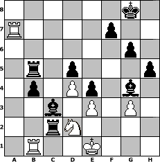 game notation in PGN-format [Event "BIRD"] [Site "www.myChess.de"] [Date "2006.03.30"] [Round "2"] [White "MichaelKnopf"] [Black "Zoidberg"] [ECO "A03"] [WhitemyELO "1502"] [BlackmyELO "1894"] [Result "0-1"] [TimeControl "10/3456000"] [WhiteDays "158"] [BlackDays "159"] [MyChessNo "24057"] 1. f4 d5 2. d4 Nf6 3. g3 c5 4. dxc5 Qa5+ 5. c3 Qxc5 6. e3 Nc6 7. b4 Qd6 8. h3 a6 9. Ba3 b5 10. Nd2 g6 11. Ngf3 Bg7 12. Bb2 O-O 13. a4 Rb8 14. axb5 axb5 15. Be2 e5 16. O-O Bxh3 17. Re1 e4 18. Nh2 h5 19. Nb3 Rfd8 20. Qd2 Ne8 21. Ra2 Be6 22. Nd4 Nxd4 23. cxd4 Rdc8 24. Rea1 Bf8 25. Ra5 Qxb4 26. Qxb4 Bxb4 27. Ra6 Rc2 28. Ba3 Bxa3 29. Kf2 b4 30. Ke1 Nc7 31. Ra7 Nb5 32. Bxb5 Rxb5 33. f5 Bxf5 34. Nf1 Bg4 35. Nd2 Bb2 36. Rb1 Bc3 0-1 position notation in FEN-format 6k1/R4p2/6p1/1r1p3p/1p1Pp1b1/2b1P1P1/2rN4/1R2K3 - - - 6 37 Captured white pieces: Captured black pieces: Click on a captured piece in order to display the desired move!