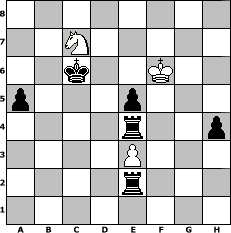 game notation in PGN-format [Event "Spa"] [Site "www.myChess.de"] [Date "2010.05.28"] [Round "1"] [White "Duesentrieb"] [Black "Master1"] [ECO "C47"] [WhitemyELO "1304"] [BlackmyELO "1332"] [Result "0-1"] [TimeControl "10/2592000"] [WhiteDays "28"] [BlackDays "28"] [MyChessNo "65779"] 1. e4 e5 2. Nf3 Nc6 3. Nc3 Nf6 4. Bc4 Bc5 5. O-O O-O 6. d3 h6 7. Nd5 Na5 8. Bb5 c6 9. Nxf6+ Qxf6 10. Qd2 Bb6 11. Ba4 d6 12. b4 Nc4 13. Qe1 Bd4 14. Rb1 Be6 15. Qe2 b5 16. Bb3 d5 17. dxc4 Bc3 18. Qe3 Bxb4 19. c5 d4 20. Qe2 Bxc5 21. Bxe6 Qxe6 22. c4 bxc4 23. h3 d3 24. Qb2 Bd6 25. g4 Rab8 26. Qa1 Rxb1 27. Qxb1 Bc7 28. Qb7 Bb6 29. Qa6 c3 30. Qxd3 Ba5 31. Qa6 Bb6 32. Kg2 Re8 33. Qd3 Bd4 34. Ba3 Qxa2 35. Bc1 c5 36. Qb5 Rf8 37. g5 a5 38. Kg3 hxg5 39. Be3 Bxe3 40. fxe3 c4 41. Qb1 Qb3 42. Qa1 c2 43. Rc1 c3 44. Ne1 Qb2 45. Nxc2 Rb8 46. Na3 Qxa1 47. Rxa1 Rb2 48. Kg4 Re2 49. Nc4 f6 50. Kf5 Kf7 51. Nd6+ Ke7 52. Nc8+ Kd7 53. Nb6+ Kc6 54. Nd5 c2 55. Ne7+ Kb6 56. Ke6 Rd2 57. Nd5+ Ka6 58. Nc7+ Kb6 59. Nd5+ Kb5 60. Nc7+ Kb6 61. Ne8 Re2 62. h4 gxh4 63. Rb1+ Kc5 64. Nxg7 cxb1=Q 65. Kxf6 Qxe4 66. Ne6+ Kd5 67. Nc7+ Kc6 0-1 position notation in FEN-format 8/2N5/2k2K2/p3p3/4r2p/4P3/4r3/8 - - - 4 68 Captured white pieces: Captured black pieces: Click on a captured piece in order to display the desired move!