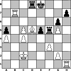 game notation in PGN-format [Event "Wanderpokal April - Chess960"] [Site "www.myChess.de"] [Date "2006.04.01"] [Round "1"] [White "bane"] [Black "73DADDELDU37"] [Variant "Fischerrandom"] [SetUp "1"] [FEN "rbnkqnbr/pppppppp/8/8/8/8/PPPPPPPP/RBNKQNBR w KQkq - 0 1"] [WhitemyELO "1929"] [BlackmyELO "1507"] [Result "1-0"] [TimeControl "10/86400"] [WhiteDays "04"] [BlackDays "04"] [MyChessNo "24193"] 1. d4 d5 2. e4 dxe4 3. Qxe4 Nd6 4. Qg4 Ng6 5. c3 Qb5 6. b3 Qxf1+ 7. Kc2 f5 8. Qh3 Ne4 9. Kb2 Nd2 10. Bd3 Qd1 11. Qxf5 Nc4+ 12. bxc4 Qa4 13. Qf3 c6 14. Bxg6 Bxc4 15. Bc2 Qb5+ 16. Nb3 Bd5 17. Qg4 g6 18. h4 a5 19. a4 Qb6 20. Rb1 Bd6 21. f3 Bxb3 22. Bxb3 Qa6 23. Qe4 Rf8 24. c4 c5 25. dxc5 Bc7 26. Qd5+ Ke8 27. Be3 Qc6 28. Bc2 Rd8 29. Qg5 Qe6 30. Rhe1 Qf6+ 31. Qxf6 Rxf6 32. Bg5 Rf7 33. Be4 Be5+ 34. Kc2 Bf4 35. Bd5 Bxg5 36. hxg5 Rf5 37. Rxb7 e5 38. Rh1 1-0 position notation in FEN-format 3rk3/1R5p/6p1/p1PBprP1/P1P5/5P2/2K3P1/7R - - - 1 38 Captured white pieces: Captured black pieces: Click on a captured piece in order to display the desired move!