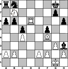game notation in PGN-format [Event "Weihnachtstunier"] [Site "www.myChess.de"] [Date "2005.12.14"] [Round "1"] [White "BirdofPray1"] [Black "NoBody"] [ECO "A04"] [WhitemyELO "2032"] [BlackmyELO "1784"] [Result "1-0"] [TimeControl "10/864000"] [WhiteDays "10"] [BlackDays "10"] [MyChessNo "20742"] 1. Nf3 b6 2. g3 Bb7 3. Bg2 e6 4. O-O f5 5. d4 Nf6 6. Nc3 Be7 7. Bf4 a6 8. Qd2 O-O 9. Rfd1 Nd5 10. Nxd5 Bxd5 11. c4 Be4 12. d5 Bf6 13. dxe6 dxe6 14. Qxd8 Bxd8 15. Nd4 Bxg2 16. Nxe6 Re8 17. Rxd8 Rxd8 18. Nxd8 Bh3 19. Rd1 c5 20. Rd6 h6 21. Nb7 1-0 position notation in FEN-format rn4k1/1N4p1/pp1R3p/2p2p2/2P2B2/6Pb/PP2PP1P/6K1 - - - 1 21 Captured white pieces: Captured black pieces: Click on a captured piece in order to display the desired move!