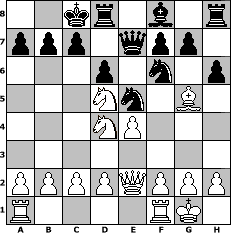 game notation in PGN-format [Event ""] [Site "www.myChess.de"] [Date "2005.07.31"] [Round "1"] [White "Chlodwig"] [Black "Vouivre"] [ECO "A40"] [WhitemyELO "1605"] [BlackmyELO "1521"] [Result "1-0"] [TimeControl "10/2592000"] [WhiteDays "60"] [BlackDays "59"] [MyChessNo "15655"] 1. d4 e5 2. dxe5 d6 3. Nf3 Nc6 4. Nc3 Bg4 5. e4 Nxe5 6. Be2 Nf6 7. O-O Qe7 8. Nd4 Bxe2 9. Qxe2 O-O-O 10. Bg5 h6 11. Nd5 1-0 position notation in FEN-format 2kr1b1r/ppp1qpp1/3p1n1p/3Nn1B1/3NP3/8/PPPPQPPP/R4RK1 - - - 1 11 Captured white pieces: Captured black pieces: Click on a captured piece in order to display the desired move!