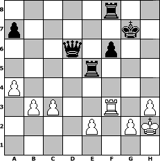 game notation in PGN-format [Event "°°°Auf ins Jahr 2012°°°"] [Site "www.myChess.de"] [Date "2011.12.25"] [Round "1"] [White "Andylein1989"] [Black "freizeitspieler"] [ECO "B01"] [WhitemyELO "1620"] [BlackmyELO "1622"] [Result "0-1"] [TimeControl "10/2592000"] [WhiteDays "099"] [BlackDays "114"] [MyChessNo "78639"] 1. e4 d5 2. exd5 Qxd5 3. Nc3 Qd8 4. Nf3 Nf6 5. Bc4 h6 6. h3 Bf5 7. d3 Nbd7 8. Be3 c6 9. a4 e5 10. O-O Bd6 11. Nd2 Qc7 12. Nde4 O-O 13. Nxd6 Qxd6 14. f4 exf4 15. Bxf4 Qd4+ 16. Kh1 b6 17. Qf3 b5 18. Bb3 b4 19. Bxh6 bxc3 20. bxc3 Qh4 21. Bxg7 Kxg7 22. Qxf5 Rae8 23. Rf4 Qh6 24. Raf1 Re5 25. Rg4+ Kh8 26. Qf4 Nxg4 27. Qxg4 Nc5 28. Qd4 f6 29. Qd6 Nxb3 30. cxb3 c5 31. d4 cxd4 32. Qxd4 Qe3 33. Qd6 Kg7 34. Rf3 Qc5 35. Kh2 Qxd6 0-1 position notation in FEN-format 5r2/p5k1/3q1p2/4r3/P7/1PP2R1P/4P1PK/8 - - - 0 36 Captured white pieces: Captured black pieces: Click on a captured piece in order to display the desired move!