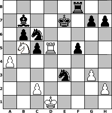game notation in PGN-format [Event "Immer wieder das Selbe."] [Site "www.myChess.de"] [Date "2018.01.31"] [Round "2"] [White "Hobbykegler"] [Black "muellerh"] [ECO "D00"] [WhitemyELO "1035"] [BlackmyELO "1479"] [Result "0-1"] [TimeControl "10/2592000"] [WhiteDays "084"] [BlackDays "113"] [MyChessNo "111210"] 1. d4 d5 2. e4 dxe4 3. Nc3 Nf6 4. f3 exf3 5. Qxf3 e6 6. Be3 Nc6 7. O-O-O Bb4 8. a3 Ba5 9. b4 Bb6 10. Bd3 Bxd4 11. Bxd4 Nxd4 12. Qe3 b6 13. Nf3 c5 14. b5 Bb7 15. Rhe1 O-O 16. Nh4 Ng4 17. Qd2 Qxh4 18. g3 Qh6 19. Qxh6 Nxh6 20. a4 a6 21. bxa6 Bxa6 22. Be4 Rad8 23. Kb2 f5 24. Bc6 Nxc6 25. Kc1 Ng4 26. Rxe6 Rxd1+ 27. Kxd1 Bb7 28. Nb5 Kf7 29. Rd6 Ke7 30. Rd5 Ne3+ 0-1 position notation in FEN-format 5r2/1b2k1pp/1pn5/1NpR1p2/P7/4n1P1/2P4P/3K4 - - - 7 31 Captured white pieces: Captured black pieces: Click on a captured piece in order to display the desired move!