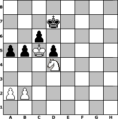 game notation in PGN-format [Event "gro"] [Site "www.myChess.de"] [Date "2005.01.21"] [Round "2"] [Board "4"] [White "Wormatia08"] [Black "1805DYDIDIDY"] [ECO "B06"] [WhitemyELO "1435"] [BlackmyELO "1574"] [Result "1-0"] [TimeControl "10/2592000"] [WhiteDays "30"] [BlackDays "30"] [MyChessNo "9744"] 1. e4 g6 2. d4 Bg7 3. c4 e6 4. Nc3 Ne7 5. Nf3 O-O 6. Be2 f5 7. exf5 Nxf5 8. O-O d5 9. cxd5 exd5 10. Bf4 a6 11. Ne5 c6 12. Bd3 Nxd4 13. Bxg6 hxg6 14. Nxg6 Rf5 15. Be3 Qf6 16. Bxd4 Qxg6 17. Bxg7 Qxg7 18. Qd3 Rg5 19. g3 Bh3 20. Rfe1 Nd7 21. Re2 Nf6 22. Rae1 Rf8 23. Re7 Rf7 24. R7e3 Bf5 25. Qe2 Bg4 26. f3 Bh5 27. Qd3 Rxg3+ 28. hxg3 Qxg3+ 29. Kf1 Ng4 30. Re8+ Kg7 31. Qd4+ Nf6 32. Ke2 Bxf3+ 33. Kd2 Qg5+ 34. Kc2 Bg4 35. Rg1 Kg6 36. Re5 Qh4 37. Kb1 Kh6 38. Qf4+ Kg6 39. Rf5 Re7 40. Rxf6+ Qxf6 41. Rxg4+ Kf7 42. Qxf6+ Kxf6 43. Kc2 Ke6 44. Kd3 b5 45. Kd4 Kd6 46. Rg6+ Re6 47. Rxe6+ Kxe6 48. Kc5 Kd7 49. Ne2 a5 50. Nd4 1-0 position notation in FEN-format 8/3k4/2p5/ppKp4/3N4/8/PP6/8 - - - 1 50 Captured white pieces: Captured black pieces: Click on a captured piece in order to display the desired move!