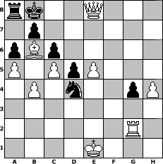 game notation in PGN-format [Event "Turnier in den M"] [Site "www.myChess.de"] [Date "2014.02.19"] [Round "1"] [White "Achimkogge"] [Black "alpacino"] [ECO "A40"] [WhitemyELO "1436"] [BlackmyELO "1304"] [Result "1-0"] [TimeControl "10/2592000"] [WhiteDays "29"] [BlackDays "25"] [MyChessNo "93106"] 1. d4 e6 2. e4 c6 3. e5 d6 4. Bf4 d5 5. Nf3 h6 6. c3 Ne7 7. Bd3 Nd7 8. Nbd2 a6 9. O-O Nf5 10. Bxf5 exf5 11. g3 Be7 12. Qc2 g6 13. Rfe1 Nb6 14. b3 Be6 15. a4 Nd7 16. b4 Nf8 17. h4 h5 18. Nf1 Nd7 19. a5 Rg8 20. Ng5 Bxg5 21. Bxg5 Qc8 22. Nh2 Qb8 23. Bf4 Qc8 24. Nf3 Qb8 25. Ng5 Qc8 26. Rac1 Qb8 27. Rb1 Qc8 28. Red1 Nf8 29. Nxe6 Nxe6 30. Be3 Qd8 31. f4 Kf8 32. Kg2 Rh8 33. Rh1 Rg8 34. Kf1 Rh8 35. Qf2 Rg8 36. Rc1 Rh8 37. Ke1 Qc8 38. c4 Qe8 39. c5 Qd8 40. Qd2 Qe8 41. Qa2 Qd7 42. Qa4 Qe8 43. Qb3 Qd8 44. Kf2 Qe8 45. Rcd1 Qd8 46. Rc1 Qe8 47. Rhe1 Qd8 48. Rg1 Qe8 49. Bd2 Qd8 50. Qd3 Qd7 51. Be3 Qd8 52. Ra1 Qc8 53. Kg2 Qd8 54. Rgf1 Qc8 55. Rfb1 Qe8 56. Re1 Qc8 57. Qe2 Qd8 58. Rh1 Qc8 59. Rag1 Qd8 60. Kf1 Qc8 61. Ke1 Qd8 62. Bf2 Qc8 63. Rg2 Qd8 64. Be3 Qc8 65. g4 fxg4 66. Qd3 Qd8 67. f5 Nc7 68. Bg5 Qd7 69. fxg6 Qe6 70. gxf7 Qxf7 71. Rf1 Qxf1+ 72. Qxf1+ Ke8 73. Qf6 Rh7 74. Qg6+ Kd7 75. Qxh7+ Kc8 76. Qxh5 Kb8 77. Bd8 Nb5 78. Bb6 Nxd4 79. Qe8# 1-0 position notation in FEN-format rk2Q3/1p6/pBp5/P1PpP3/1P1n2pP/8/6R1/4K3 - - - 1 79 Captured white pieces: Captured black pieces: Click on a captured piece in order to display the desired move!