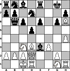 game notation in PGN-format [Event "Freizeitschach"] [Site "www.myChess.de"] [Date "2011.02.28"] [Round "1"] [White "Knight"] [Black "Macks"] [ECO "A45"] [WhitemyELO "1153"] [BlackmyELO "1215"] [Result "0-1"] [TimeControl "10/2592000"] [WhiteDays "60"] [BlackDays "56"] [MyChessNo "72387"] 1. d4 Nf6 2. Nc3 g6 3. e4 Bg7 4. f3 O-O 5. Be3 e6 6. Bd3 c6 7. Qd2 d5 8. e5 Nfd7 9. O-O-O f6 10. exf6 Bxf6 11. Bh6 Re8 12. h4 Bxd4 13. Bg5 Qb6 14. Bh6 Be3 0-1 position notation in FEN-format rnb1r1k1/pp1n3p/1qp1p1pB/3p4/7P/2NBbP2/PPPQ2P1/2KR2NR - - - 4 15 Captured white pieces: Captured black pieces: Click on a captured piece in order to display the desired move!