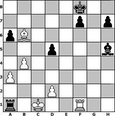 game notation in PGN-format [Event "Spa"] [Site "www.myChess.de"] [Date "2010.02.08"] [Round "1"] [White "Knight"] [Black "Master1"] [ECO "D00"] [WhitemyELO "1151"] [BlackmyELO "1191"] [Result "0-1"] [TimeControl "10/2592000"] [WhiteDays "30"] [BlackDays "30"] [MyChessNo "63193"] 1. d4 d5 2. e4 dxe4 3. Nc3 Nf6 4. f3 exf3 5. Qxf3 e6 6. Be3 Bb4 7. Nge2 Nc6 8. O-O-O O-O 9. a3 Bxc3 10. Nxc3 a6 11. d5 exd5 12. Nxd5 Bg4 13. Nxf6+ Qxf6 14. Qxf6 gxf6 15. Re1 Rae8 16. Bd3 Ne5 17. h3 Nxd3+ 18. cxd3 Bf5 19. d4 Be4 20. Rhg1 c6 21. g4 Kg7 22. h4 b6 23. g5 Bg6 24. gxf6+ Kxf6 25. Bg5+ Kg7 26. Rxe8 Rxe8 27. h5 Bxh5 28. Bh4+ Kf8 29. b4 Re4 30. Bf2 Re2 31. Rf1 Ra2 32. d5 cxd5 33. Bxb6 Ra1+ 0-1 position notation in FEN-format 5k2/5p1p/pB6/3p3b/1P6/P7/3P4/r1K2R2 - - - 1 34 Captured white pieces: Captured black pieces: Click on a captured piece in order to display the desired move!