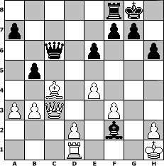game notation in PGN-format [Event "Turnier in den M"] [Site "www.myChess.de"] [Date "2014.02.19"] [Round "1"] [White "reisinger"] [Black "Andylein1989"] [ECO "D35"] [WhitemyELO "1480"] [BlackmyELO "1339"] [Result "0-1"] [TimeControl "10/2592000"] [WhiteDays "30"] [BlackDays "30"] [MyChessNo "93059"] 1. d4 d5 2. c4 e6 3. Nc3 Nf6 4. a3 b6 5. Bg5 Be7 6. Qc2 Bb7 7. e3 c5 8. dxc5 Bxc5 9. Nf3 h6 10. Bf4 dxc4 11. Rd1 Qc8 12. Be2 O-O 13. O-O Nd5 14. Bxb8 Rxb8 15. Bxc4 Nxc3 16. Qxc3 Bxf3 17. gxf3 Qc6 18. e4 Rbd8 19. Kh1 Rxd1 20. Rxd1 Bxf2 21. b3 b5 0-1 position notation in FEN-format 5rk1/p4pp1/2q1p2p/1p6/2B1P3/PPQ2P2/3P1b1P/3R3K - - - 0 22 Captured white pieces: Captured black pieces: Click on a captured piece in order to display the desired move!