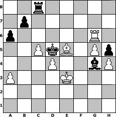 game notation in PGN-format [Event "Gary COME BACK Turnier"] [Site "www.myChess.de"] [Date "2005.03.18"] [Round "1"] [White "UPS"] [Black "Sizilianer"] [ECO "B23"] [WhitemyELO "1627"] [BlackmyELO "1530"] [Result "1-0"] [TimeControl "10/1728000"] [WhiteDays "20"] [BlackDays "20"] [MyChessNo "11248"] 1. e4 c5 2. Nc3 Nc6 3. Nf3 d6 4. d4 cxd4 5. Nxd4 Nf6 6. Bb5 Bd7 7. O-O e6 8. a3 Be7 9. Nxc6 Bxc6 10. Bd3 e5 11. f4 exf4 12. Rxf4 O-O 13. Be3 Nd7 14. Qe2 Ne5 15. Nd5 Nxd3 16. Nxe7+ Qxe7 17. cxd3 a6 18. Bd4 f6 19. Raf1 Rf7 20. Qf3 Raf8 21. g4 h6 22. h4 Bb5 23. Rf2 Bc6 24. Bc3 Qe6 25. Rf5 g6 26. Rxf6 Rxf6 27. Bxf6 Bd7 28. g5 h5 29. d4 Qc4 30. Qc3 Qxc3 31. bxc3 Re8 32. e5 dxe5 33. Bxe5 Bf5 34. c4 Rc8 35. c5 Kf7 36. Kg2 Ke6 37. Kf3 Kd5 38. Rb2 Bg4+ 39. Ke3 Kc6 40. Rb6+ Kd5 41. Rxg6 1-0 position notation in FEN-format 2r5/1p6/p5R1/2PkB1Pp/3P2bP/P3K3/8/8 - - - 0 41 Captured white pieces: Captured black pieces: Click on a captured piece in order to display the desired move!