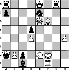 game notation in PGN-format [Event "Blackmar-Diemer"] [Site "www.myChess.de"] [Date "2009.08.30"] [Round "1"] [White "Meister64"] [Black "rakl"] [ECO "D00"] [WhitemyELO "1738"] [BlackmyELO "1883"] [Result "1-0"] [TimeControl "10/2592000"] [WhiteDays "117"] [BlackDays "111"] [MyChessNo "58607"] 1. d4 d5 2. e4 dxe4 3. Nc3 Nf6 4. f3 exf3 5. Qxf3 c6 6. Be3 Bg4 7. Qf2 e6 8. h3 Bf5 9. O-O-O Qa5 10. Bc4 b5 11. Bb3 Nbd7 12. g4 Bg6 13. Nge2 h6 14. Nf4 Bh7 15. Rhf1 Be7 16. Qf3 O-O 17. h4 b4 18. Nce2 Be4 19. Qh3 Nd5 20. Nxd5 Bxd5 21. Bxd5 cxd5 22. g5 Qxa2 23. gxh6 Nb6 24. Kd2 Nc4+ 25. Ke1 b3 26. hxg7 Rfc8 27. Bg5 bxc2 28. Rc1 Bb4+ 29. Kf2 Nd6 30. Qf3 f6 31. Bxf6 Bd2 32. Qh5 Bxc1 33. Be5 Nf5 34. Qh8+ Kf7 35. g8=Q+ Rxg8 36. Qf6+ Ke8 37. Qxe6+ Ne7 38. Bf6 1-0 position notation in FEN-format r3k1r1/p3n3/4QB2/3p4/3P3P/8/qPp1NK2/2b2R2 - - - 2 38 Captured white pieces: Captured black pieces: Click on a captured piece in order to display the desired move!