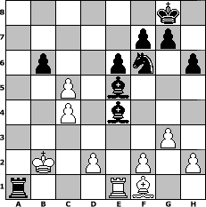 game notation in PGN-format [Event "Sommer 2019"] [Site "www.myChess.de"] [Date "2019.07.17"] [Round "1"] [White "Hobbykegler"] [Black "kalle"] [ECO "A15"] [WhitemyELO "1028"] [BlackmyELO "1649"] [Result "0-1"] [TimeControl "10/2592000"] [WhiteDays "69"] [BlackDays "61"] [MyChessNo "115384"] 1. c4 Nf6 2. b3 c5 3. Bb2 e6 4. Qc2 d5 5. Nc3 d4 6. Ne4 Nbd7 7. b4 b6 8. b5 Bb7 9. Nxf6+ Nxf6 10. Nf3 Bd6 11. O-O-O O-O 12. Ng5 a6 13. bxa6 Rxa6 14. e3 h6 15. Nh3 Rxa2 16. Nf4 Qc7 17. exd4 Bxf4 18. Kb1 Rfa8 19. g3 Bxh1 20. dxc5 Qa7 21. Qc3 Bf3 22. Re1 Be4+ 23. Kc1 Ra1+ 24. Bxa1 Qxa1+ 25. Qxa1 Rxa1+ 26. Kb2 Be5+ 0-1 position notation in FEN-format 6k1/5pp1/1p2pn1p/2P1b3/2P1b3/6P1/1K1P1P1P/r3RB2 - - - 2 27 Captured white pieces: Captured black pieces: Click on a captured piece in order to display the desired move!