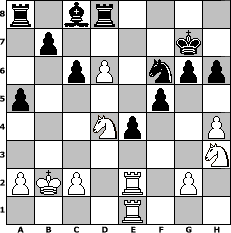 game notation in PGN-format [Event "Wrixum - Open die XIII"] [Site "www.myChess.de"] [Date "2016.09.28"] [Round "1"] [White "espero"] [Black "Helmut48"] [ECO "A45"] [WhitemyELO "1921"] [BlackmyELO "2011"] [Result "0-1"] [TimeControl "10/2592000"] [WhiteDays "29"] [BlackDays "30"] [MyChessNo "105048"] 1. d4 Nf6 2. Bg5 Ne4 3. Bf4 d5 4. f3 Nf6 5. e4 dxe4 6. Nc3 exf3 7. Nxf3 g6 8. Bc4 Bg7 9. Qe2 O-O 10. O-O-O c6 11. d5 Qb6 12. d6 e6 13. Be5 Nbd7 14. Rhf1 Nd5 15. Bxg7 Kxg7 16. Qd2 a5 17. h4 Ne3 18. Ne4 Qxb2+ 19. Kxb2 Nxc4+ 20. Kc3 Nxd2 21. Rxd2 f5 22. Neg5 Re8 23. Re1 e5 24. Rde2 e4 25. Nd4 Nf6 26. Kb2 h6 27. Nh3 Rd8 0-1 position notation in FEN-format r1br4/1p4k1/2pP1npp/p4p2/3Np2P/7N/PKP1R1P1/4R3 - - - 2 28 Captured white pieces: Captured black pieces: Click on a captured piece in order to display the desired move!