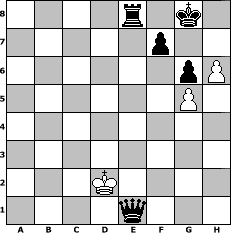 game notation in PGN-format [Event "Der sizillianische Drachen"] [Site "www.myChess.de"] [Date "2004.06.23"] [Round "2"] [White "Master1"] [Black "MaxPayne"] [ECO "B70"] [WhitemyELO "1178"] [BlackmyELO "1493"] [Result "0-1"] [TimeControl "10/3456000"] [WhiteDays "194"] [BlackDays "178"] [MyChessNo "5360"] 1. e4 c5 2. Nf3 d6 3. d4 cxd4 4. Nxd4 Nf6 5. Nc3 g6 6. Bd3 a6 7. O-O Bg7 8. Nd5 Nxd5 9. c3 Nf6 10. Be3 O-O 11. f4 Nc6 12. Nxc6 bxc6 13. f5 e5 14. b4 d5 15. fxg6 hxg6 16. a4 Bg4 17. Be2 Bxe2 18. Qxe2 Nxe4 19. Rac1 a5 20. b5 cxb5 21. axb5 Rc8 22. b6 Nc5 23. Bxc5 Rxc5 24. Qa6 Bh6 25. b7 Bxc1 26. Rxc1 Qc7 27. Rb1 Rxc3 28. g4 Rc1+ 29. Rxc1 Qxc1+ 30. Kf2 Qb2+ 31. Ke1 d4 32. h4 e4 33. Qxa5 d3 34. Qd2 Qxb7 35. h5 Qb1+ 36. Qd1 Qxd1+ 37. Kxd1 e3 38. h6 Re8 39. g5 e2+ 40. Ke1 d2+ 41. Kxd2 e1=Q+ 0-1 position notation in FEN-format 4r1k1/5p2/6pP/6P1/8/8/3K4/4q3 - - - 0 42 Captured white pieces: Captured black pieces: Click on a captured piece in order to display the desired move!