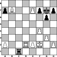 game notation in PGN-format [Event "Der sizillianische Drachen"] [Site "www.myChess.de"] [Date "2004.06.23"] [Round "1"] [White "myfairlady"] [Black "Sanji"] [ECO "B70"] [WhitemyELO "1780"] [BlackmyELO "1109"] [Result "1-0"] [TimeControl "10/3456000"] [WhiteDays "155"] [BlackDays "136"] [MyChessNo "5322"] 1. e4 c5 2. Nf3 d6 3. d4 cxd4 4. Nxd4 Nf6 5. Nc3 g6 6. g3 Bg7 7. Bg2 Qc7 8. Bg5 O-O 9. Bxf6 Bxf6 10. Nd5 Qa5+ 11. b4 Qa6 12. Nxf6+ exf6 13. Qd2 Nc6 14. b5 Qb6 15. bxc6 bxc6 16. O-O Qc5 17. Nb3 Qe5 18. f4 Qb2 19. Qxd6 Qxc2 20. Qxf6 Ba6 21. Rf2 Qc4 22. Rc1 Qb5 23. e5 Rac8 24. Nd4 Qb4 25. Nxc6 Rxc6 26. Bxc6 Rc8 27. e6 Qf8 28. e7 Qg7 29. Qxg7+ Kxg7 30. Rd2 Bb7 31. Bxb7 Rxc1+ 32. Kf2 1-0 position notation in FEN-format 8/pB2Ppkp/6p1/8/5P2/6P1/P2RPK1P/2r5 - - - 1 32 Captured white pieces: Captured black pieces: Click on a captured piece in order to display the desired move!