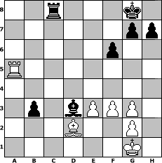 game notation in PGN-format [Event "?"] [Site "www.myChess.de"] [Date "2025.07.08"] [Round "?"] [White "Seneca"] [Black "spiderman"] [ECO "A45"] [WhitemyELO "1541"] [BlackmyELO "1747"] [Result "0-1"] [TimeControl "10/2592000"] [WhiteDays "30"] [BlackDays "29"] [MyChessNo "133505"] 1. d4 Nf6 2. e3 d5 3. Nf3 e6 4. c4 Nc6 5. a3 Be7 6. Be2 O-O 7. O-O Ne4 8. Nc3 Nxc3 9. bxc3 b6 10. cxd5 exd5 11. c4 Bf5 12. Nd2 dxc4 13. Nxc4 Qd5 14. f3 b5 15. Nb2 a6 16. Nd3 Nxd4 17. Nf4 Nxe2+ 18. Qxe2 Qb3 19. Bb2 Bc5 20. Bd4 Bd6 21. Nh5 f6 22. Rfc1 Rfc8 23. Ng3 Bd3 24. Qa2 Qxa2 25. Rxa2 c5 26. Bc3 Bxg3 27. hxg3 b4 28. axb4 cxb4 29. Bd2 a5 30. Rxc8+ Rxc8 31. Rxa5 b3 0-1 position notation in FEN-format 2r3k1/6pp/5p2/R7/8/1p1bPPP1/3B2P1/6K1 - - - 0 32 Captured white pieces: Captured black pieces: Click on a captured piece in order to display the desired move!