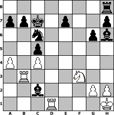 game notation in PGN-format [Event "TM7E - E60 - K"] [Site "www.myChess.de"] [Date "2013.01.15"] [Round "1"] [White "Steffi"] [Black "Teresa"] [ECO "E61"] [WhitemyELO "1541"] [BlackmyELO "1536"] [Result "0-1"] [TimeControl "10/2592000"] [WhiteDays "30"] [BlackDays "29"] [MyChessNo "86157"] 1. d4 Nf6 2. c4 g6 3. Nc3 d6 4. e4 Bg7 5. Nf3 c5 6. dxc5 dxc5 7. Qxd8+ Kxd8 8. Bf4 Nc6 9. Nb5 Nxe4 10. Nc7 Rb8 11. Ne6+ Bxe6 12. Bxb8 Nxb8 13. Bd3 f5 14. O-O Nc6 15. Rfd1 Kc7 16. Bxe4 fxe4 17. Nd2 Bxb2 18. Rab1 Bd4 19. a4 e3 20. fxe3 Bxe3+ 21. Kh1 Bf5 22. Rb3 Bh6 23. Nf3 Bc2 0-1 position notation in FEN-format 7r/ppk1p2p/2n3pb/2p5/P1P5/1R3N2/2b3PP/3R3K - - - 6 24 Captured white pieces: Captured black pieces: Click on a captured piece in order to display the desired move!