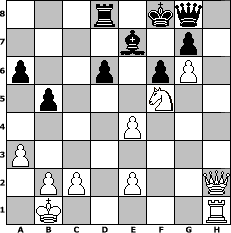 game notation in PGN-format [Event "Najdorf mit f4"] [Site "www.myChess.de"] [Date "2022.02.01"] [Round "2"] [White "Grubengeist"] [Black "alibengali"] [ECO "B93"] [WhitemyELO "2008"] [BlackmyELO "1624"] [Result "1-0"] [TimeControl "10/2592000"] [WhiteDays "120"] [BlackDays "088"] [MyChessNo "124543"] 1. e4 c5 2. Nf3 d6 3. d4 cxd4 4. Nxd4 Nf6 5. Nc3 a6 6. f4 e5 7. Nb3 Nbd7 8. g4 h6 9. g5 hxg5 10. fxg5 Nh5 11. Qf3 Nb6 12. Be3 Be6 13. O-O-O Nc4 14. Bxc4 Bxc4 15. Nd5 Bxd5 16. Rxd5 Be7 17. Rf1 f6 18. Kb1 Nf4 19. Bxf4 exf4 20. g6 Rxh2 21. Qxf4 Rh6 22. Nd4 Qd7 23. Rg1 Rh8 24. Nf5 Kf8 25. Rgd1 Rd8 26. a3 Qe6 27. R5d2 b5 28. Rh2 Rxh2 29. Qxh2 Qg8 30. Rh1 1-0 position notation in FEN-format 3r1kq1/4b1p1/p2p1pP1/1p3N2/4P3/P7/1PP1P2Q/1K5R - - - 2 30 Captured white pieces: Captured black pieces: Click on a captured piece in order to display the desired move!