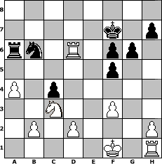 game notation in PGN-format [Event "Clubmeisterschaft Aljechins Enkel"] [Site "www.myChess.de"] [Date "2015.10.17"] [Round "1"] [White "Helmut48"] [Black "Joschi"] [ECO "A58"] [WhitemyELO "1959"] [BlackmyELO "1604"] [Result "1-0"] [TimeControl "10/2592000"] [WhiteDays "86"] [BlackDays "90"] [MyChessNo "100801"] 1. d4 Nf6 2. c4 c5 3. d5 b5 4. cxb5 a6 5. bxa6 Bxa6 6. Nc3 d6 7. f4 Nbd7 8. e4 Bxf1 9. Kxf1 g6 10. Nf3 Bg7 11. Qe2 O-O 12. e5 dxe5 13. fxe5 Ng4 14. Bf4 f6 15. e6 Nb6 16. d6 Ne5 17. d7 Nxf3 18. gxf3 f5 19. Be5 Bxe5 20. Qxe5 c4 21. a4 Rf6 22. Rd1 Ra6 23. Qxf6 exf6 24. e7 Qxe7 25. d8=Q+ Qxd8 26. Rxd8+ Kf7 27. Rd6 1-0 position notation in FEN-format 8/5k1p/rn1R1pp1/5p2/P1p5/2N2P2/1P1P3P/5K1R - - - 2 27 Captured white pieces: Captured black pieces: Click on a captured piece in order to display the desired move!
