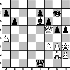game notation in PGN-format [Event "Fruehjahr 2009"] [Site "www.myChess.de"] [Date "2009.03.12"] [Round "2"] [White "bruno"] [Black "jeremyt"] [ECO "A16"] [WhitemyELO "1702"] [BlackmyELO "1787"] [Result "0-1"] [TimeControl "10/2592000"] [WhiteDays "150"] [BlackDays "143"] [MyChessNo "53568"] 1. c4 Nf6 2. Nc3 c5 3. e3 g6 4. Nf3 Bg7 5. d4 O-O 6. Bd3 cxd4 7. exd4 d5 8. O-O Nc6 9. cxd5 Nxd5 10. a3 Nxd4 11. Be4 Nxc3 12. bxc3 Nb5 13. Qc2 Nxc3 14. Bb2 Bd7 15. Bxc3 Rc8 16. Rfd1 Rxc3 17. Qd2 Rc7 18. Rac1 Rxc1 19. Qxc1 Qc8 20. Qg5 Ba4 21. Rc1 Qd7 22. Qe3 Rc8 23. Rxc8+ Qxc8 24. g3 b6 25. Qf4 Qc4 26. Ne5 Bxe5 27. Qxe5 Bb5 28. Kg2 Qf1+ 29. Kf3 Qd1+ 30. Kf4 Qd2+ 31. Kf3 Be2+ 32. Kg2 Qe1 33. Qb8+ Kg7 34. Qe5+ Kh6 35. Kh3 f6 36. Qf4+ g5 37. Qb8 Kg7 38. Qc7 Bf1+ 39. Bg2 h5 40. Qd7 Bb5 41. Qf5 Be2 42. f3 Bc4 43. a4 Be6 0-1 position notation in FEN-format 8/p3p1k1/1p2bp2/5Qpp/P7/5PPK/6BP/4q3 - - - 1 44 Captured white pieces: Captured black pieces: Click on a captured piece in order to display the desired move!