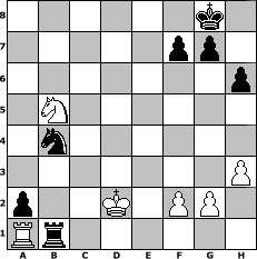 game notation in PGN-format [Event "Ab in den Herbst"] [Site "www.myChess.de"] [Date "2014.09.23"] [Round "1"] [White "Joschi"] [Black "Rotstift10"] [ECO "C70"] [WhitemyELO "1588"] [BlackmyELO "1592"] [Result "0-1"] [TimeControl "10/864000"] [WhiteDays "09"] [BlackDays "06"] [MyChessNo "96045"] 1. e4 e5 2. Nf3 Nc6 3. Bb5 a6 4. Ba4 Bc5 5. O-O h6 6. c3 b5 7. Bb3 Nf6 8. d3 d6 9. h3 O-O 10. Re1 a5 11. Be3 Bxe3 12. Rxe3 a4 13. Bc2 Be6 14. Nbd2 a3 15. b3 b4 16. cxb4 Nxb4 17. d4 exd4 18. Nxd4 Bd7 19. Nc4 c5 20. Nf3 Bc6 21. Bb1 Re8 22. Qxd6 Nxe4 23. Bxe4 Bxe4 24. Rc3 Qxd6 25. Nxd6 Re6 26. Nxe4 Rxe4 27. Rxc5 Re2 28. Kf1 Rxa2 29. Rxa2 Nxa2 30. Nd4 Nb4 31. Rc1 a2 32. Ra1 Rd8 33. Nb5 Rd3 34. Ke2 Rxb3 35. Kd2 Rb1 0-1 position notation in FEN-format 6k1/5pp1/7p/1N6/1n6/7P/p2K1PP1/Rr6 - - - 2 36 Captured white pieces: ![]() ![]() ![]() ![]() ![]() ![]() ![]() ![]() ![]() ![]() ![]() ![]() ![]() ![]() ![]() Captured black pieces: ![]() ![]() ![]() ![]() ![]() ![]() ![]() ![]() ![]() ![]() ![]() ![]() ![]() ![]() ![]() Click on a captured piece in order to display the desired move!