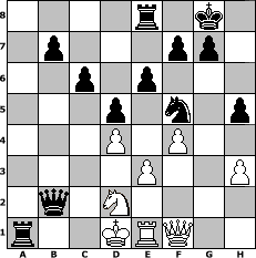 game notation in PGN-format [Event "Ohne techn. Hilfsmittel..."] [Site "www.myChess.de"] [Date "2013.02.13"] [Round "1"] [White "hape50"] [Black "Stoertebecker"] [ECO "D00"] [WhitemyELO "1323"] [BlackmyELO "1773"] [Result "0-1"] [TimeControl "10/864000"] [WhiteDays "34"] [BlackDays "28"] [MyChessNo "86539"] 1. d4 d5 2. h3 h6 3. Nf3 Nf6 4. e3 Bf5 5. Bd3 Bxd3 6. Qxd3 Nc6 7. a3 e6 8. Nbd2 Be7 9. b4 a6 10. O-O O-O 11. Bb2 Re8 12. Nh2 Bd6 13. f4 Ne7 14. Ndf3 Ne4 15. Rf2 Nxf2 16. Kxf2 Nf5 17. Ng4 c6 18. Re1 a5 19. c3 axb4 20. cxb4 Qe7 21. Nfe5 h5 22. Nh2 Qh4+ 23. Ke2 Qg3 24. Nef3 Qxg2+ 25. Kd1 Qxb2 26. Nd2 Rxa3 27. Qf1 Bxb4 28. Nhf3 Bxd2 29. Nxd2 Ra1+ 0-1 position notation in FEN-format 4r1k1/1p3pp1/2p1p3/3p1n1p/3P1P2/4P2P/1q1N4/r2KRQ2 - - - 1 30 Captured white pieces: Captured black pieces: Click on a captured piece in order to display the desired move!