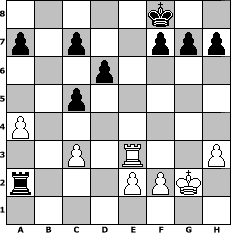 game notation in PGN-format [Event "Es wird bald Sommer"] [Site "www.myChess.de"] [Date "2015.05.12"] [Round "1"] [White "Schefsche"] [Black "Gordholm"] [ECO "C22"] [WhitemyELO "1452"] [BlackmyELO "1499"] [Result "0-1"] [TimeControl "10/2592000"] [WhiteDays "26"] [BlackDays "25"] [MyChessNo "99208"] 1. e4 e5 2. d4 exd4 3. Qxd4 Nc6 4. Qd1 Nf6 5. Nc3 Bb4 6. Bd2 O-O 7. Bd3 Re8 8. Nf3 d6 9. O-O Bg4 10. h3 Bh5 11. Bb5 Nxe4 12. Bxc6 bxc6 13. Nxe4 Rxe4 14. Bxb4 Rxb4 15. Qc1 Qf6 16. Re1 Bxf3 17. gxf3 Qxf3 18. Qe3 Qxe3 19. Rxe3 Rxb2 20. c3 Kf8 21. a4 Re8 22. Re1 Rxe3 23. Rxe3 c5 24. Kg2 Ra2 0-1 position notation in FEN-format 5k2/p1p2ppp/3p4/2p5/P7/2P1R2P/r3PPK1/8 - - - 2 25 Captured white pieces: Captured black pieces: Click on a captured piece in order to display the desired move!