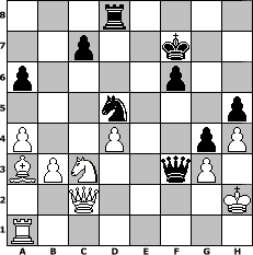 game notation in PGN-format [Event "Hauptsache SPASS"] [Site "www.myChess.de"] [Date "2003.11.30"] [Round "2"] [White "Anji"] [Black "k2piet"] [ECO "A00"] [WhitemyELO "1406"] [BlackmyELO "1342"] [Result "1-0"] [TimeControl "10/2592000"] [WhiteDays "57"] [BlackDays "00"] [MyChessNo "1538"] 1. h4 h5 2. g3 e5 3. Nf3 d6 4. Ng5 f6 5. Nf3 e4 6. Nd4 Nc6 7. Nb5 Bg4 8. f3 exf3 9. exf3 Be6 10. c4 a6 11. N5c3 g5 12. Ne4 g4 13. d3 d5 14. cxd5 Qxd5 15. Rh2 Nd4 16. a4 Nxf3+ 17. Kf2 Nxh2 18. Bg2 Bc5+ 19. Nxc5 Qxc5+ 20. d4 Qf5+ 21. Kg1 Rd8 22. Kxh2 Rh7 23. Bxb7 Qf2+ 24. Kh1 Bd5+ 25. Bxd5 Ne7 26. Qd2 Qf5 27. Nc3 Nxd5 28. b3 Re7 29. Ba3 Qf3+ 30. Kh2 Re2+ 31. Qxe2+ Kf7 32. Qc2 1-0 position notation in FEN-format 3r4/2p2k2/p4p2/3n3p/P2P2pP/BPN2qP1/2Q4K/R7 - - - 2 32 Captured white pieces: ![]() ![]() ![]() ![]() ![]() ![]() ![]() ![]() ![]() ![]() ![]() ![]() ![]() ![]() ![]() Captured black pieces: ![]() ![]() ![]() ![]() ![]() ![]() ![]() ![]() ![]() ![]() ![]() ![]() ![]() ![]() ![]() Click on a captured piece in order to display the desired move!