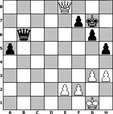 game notation in PGN-format [Event "4. Norderstedter DENK MAL Open 2013"] [Site "www.myChess.de"] [Date "2013.01.09"] [Round "1"] [White "Vahl1"] [Black "haggard"] [ECO "B30"] [WhitemyELO "1656"] [BlackmyELO "1985"] [Result "0-1"] [TimeControl "10/2592000"] [WhiteDays "14"] [BlackDays "30"] [MyChessNo "86039"] 1. e4 c5 2. Nf3 Nc6 3. Bc4 g6 4. O-O Bg7 5. c3 e6 6. d4 cxd4 7. Nxd4 Nge7 8. Nxc6 bxc6 9. Re1 d5 10. exd5 cxd5 11. Bd3 O-O 12. Bf4 Qb6 13. b4 Ba6 14. Be3 d4 15. cxd4 Bxd3 16. Qxd3 Qxb4 17. Nd2 Nf5 18. a3 Qa4 19. Nf3 Rad8 20. Red1 Nxd4 21. Nxd4 Bxd4 22. Bxd4 e5 23. Qf3 Rxd4 24. Rxd4 exd4 25. Rd1 Rc8 26. h3 Rb8 27. Rd3 Qd7 28. Qg3 Rd8 29. Qf4 Qc6 30. Rxd4 Rxd4 31. Qxd4 Qc1+ 32. Kh2 Qxa3 33. Qd8+ Qf8 34. Qd5 Qb8+ 35. g3 Qb6 36. Kg1 a5 37. Qe5 h5 38. Qe8+ Kg7 0-1 position notation in FEN-format 4Q3/5pk1/1q4p1/p6p/8/6PP/4PP2/6K1 - - - 2 39 Captured white pieces: Captured black pieces: Click on a captured piece in order to display the desired move!