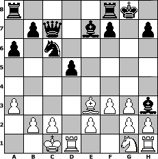 game notation in PGN-format [Event "MN-2012-1"] [Site "www.myChess.de"] [Date "2012.07.24"] [Round "1"] [White "spiderman"] [Black "MathiasNowak"] [ECO "A00"] [WhitemyELO "1737"] [BlackmyELO "1513"] [Result "0-1"] [TimeControl "10/2592000"] [WhiteDays "21"] [BlackDays "28"] [MyChessNo "82919"] 1. g3 e5 2. d4 exd4 3. Qxd4 Nf6 4. Bf4 Nc6 5. Qe3+ Be7 6. Nc3 d5 7. Nb5 O-O 8. Bxc7 Qd7 9. a3 Ng4 10. Qf4 g5 11. f3 gxf4 12. Bxf4 a6 13. Nc7 Ne3 14. Bh3 Qd8 15. Bxe3 Qxc7 16. O-O-O Bxh3 0-1 position notation in FEN-format r4rk1/1pq1bp1p/p1n5/3p4/8/P3BPPb/1PP1P1PP/2KR2NR - - - 0 17 Captured white pieces: Captured black pieces: Click on a captured piece in order to display the desired move!