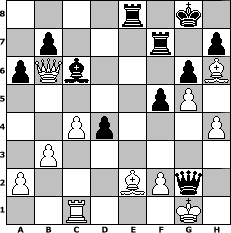 game notation in PGN-format [Event "Schach Schach Schach....."] [Site "www.myChess.de"] [Date "2018.10.23"] [Round "1"] [White "Hobbykegler"] [Black "beowulf"] [ECO "B30"] [WhitemyELO "1009"] [BlackmyELO "1415"] [Result "0-1"] [TimeControl "10/2592000"] [WhiteDays "24"] [BlackDays "30"] [MyChessNo "113336"] 1. e4 c5 2. Nf3 Nc6 3. Be2 Nf6 4. Nc3 g6 5. O-O d5 6. exd5 Nxd5 7. Nxd5 Qxd5 8. c4 Qd8 9. Qc2 Bf5 10. Qc3 f6 11. b3 e5 12. Re1 Bd6 13. g3 O-O 14. h4 Qe7 15. d3 Nd4 16. Nxd4 cxd4 17. Qd2 Bb4 18. Qd1 Bxe1 19. Qxe1 a6 20. g4 Bd7 21. Bh6 Rf7 22. g5 f5 23. Qa5 Bc6 24. Re1 Re8 25. Rc1 e4 26. dxe4 Qxe4 27. Qb6 Qg2# 0-1 position notation in FEN-format 4r1k1/1p3r1p/pQb3pB/5pP1/2Pp3P/1P6/P3BPq1/2R3K1 - - - 2 28 Captured white pieces: Captured black pieces: Click on a captured piece in order to display the desired move!